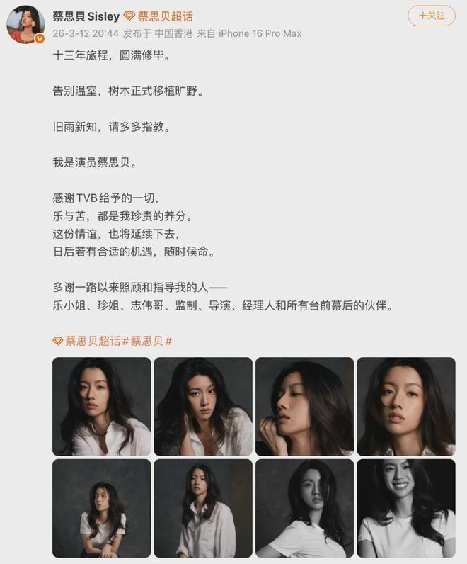 昨晚(12日),香港女演员蔡思贝发文宣布告别TVB,并点名感谢这3人:乐小姐、珍姐、志伟哥。