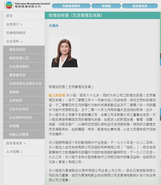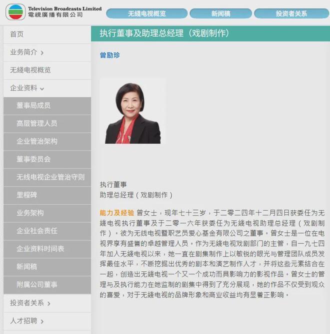 “珍姐”曾励珍,现年73岁,于2024年12月4日获委任为无线电视执行董事,于2016年获委任为无线电视助理总经理(戏剧制作)。